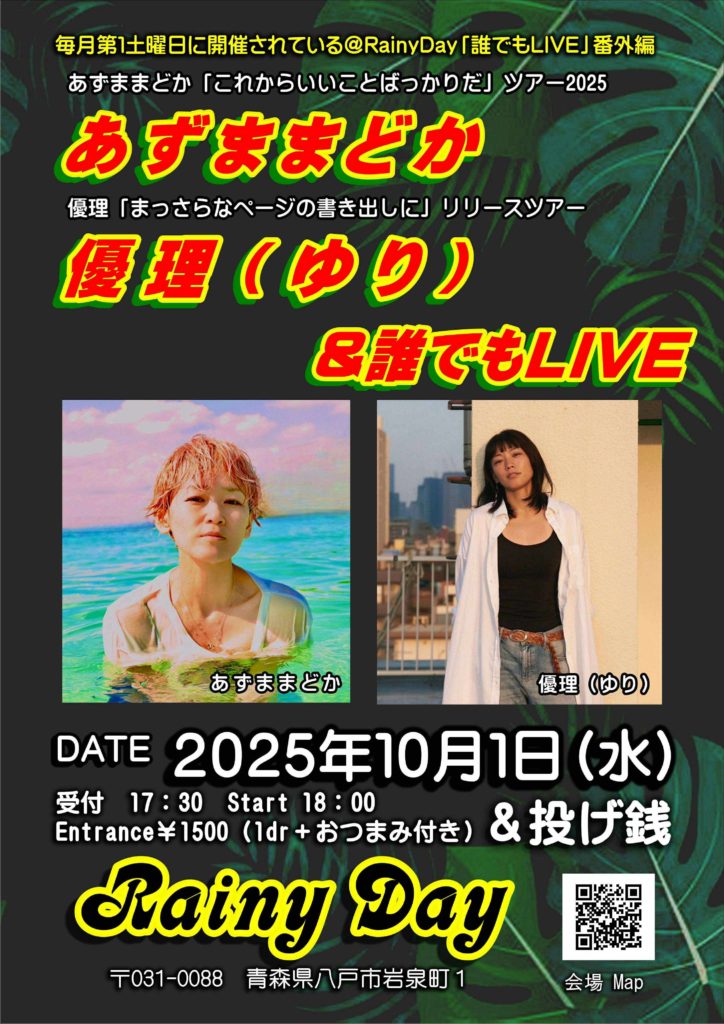 open 17:30 start 18:00 charge ¥1500(1drink+おつまみ付き)&投げ銭 with:優理、誰でもLIVE Post Share Hatena Pocket RSS feedly Pin it この記事のタイトルとURLをコピーする 2025/9/30(火)宮城南三陸猫音小屋 前の記事 10/12(日) 兵庫神戸新長田駅前 次の記事